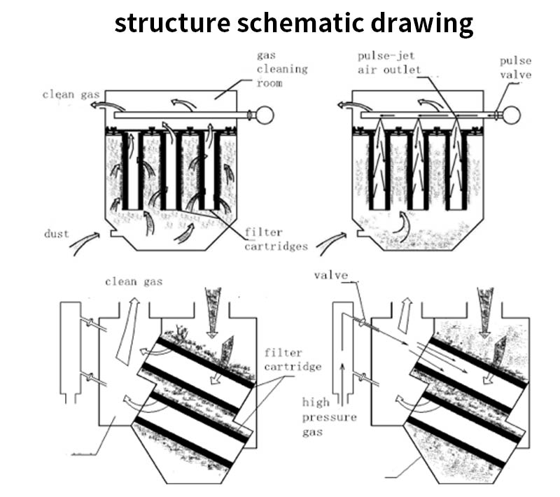 Generally, there are two main installation ways of filter cartridges in dust collectors that conclude inclined (horizontal) layout and vertical layout. It is convenient to assemble and disassemble filter cartridges in inclined (horizontal) layout, and it is better to use inclined (horizontal) layout in low dust concentration occasion. Also, while vertical layout, the cartridges can be installed from the top or the bottom. While installing from the top, filter cartridges are above the tubesheet and inserted into the tubesheet pore downward,then fixed on the tubesheet; on the other hand, while installing from the bottom, filter cartridges are under the tubesheet and installed upward, then fixed on the tubesheet. It is convenient to assemble and disassemble filter cartridges while installing from the top because it is unnecessary for operation staffs to go into the box of the dust collectors for operation; on the contrary, it is difficult for operation staffs to assemble and disassemble filter cartridges while installing from the bottom because they have to go into the box with poor working condition to operate. It is more suitable for high dust concentration occasion to use vertical layout of filter cartridges. Pulse-jet dust cleaning effect for vertical layout of filter cartridges is better than inclined (horizontal) layout when dust concentration occasion is high.